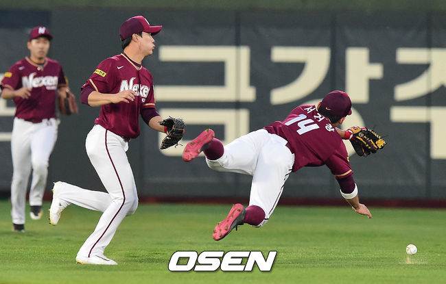 4일 오후 부산 사직야구장에서 열린 '2017 타이어뱅크 KBO 리그' 롯데 자이언츠와 넥센 히어로즈의 경기 1회말 선두타자 전준우의 중견수 앞 2루타 타구를 서건창이 다이빙 캐치를 시도하지만 못 잡고 있다. / baik@osen.co.kr