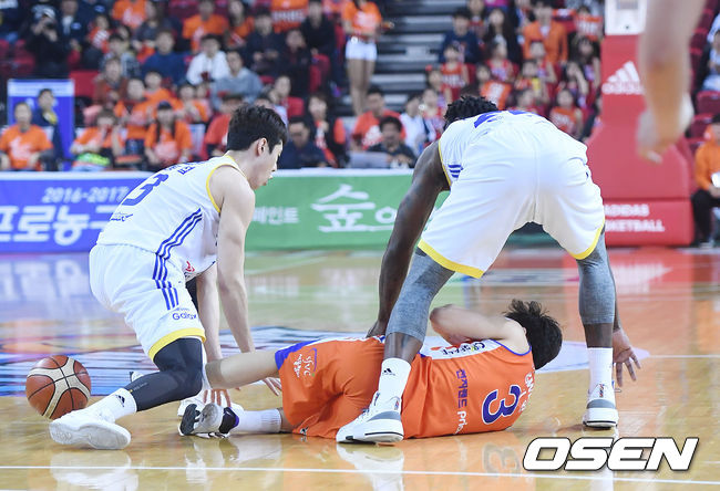 4일 오후 인천 부평구 삼산월드체육관에서 '2016-2017 KCC 프로농구' 6강 플레이오프 3차전 인천 전자랜드와 서울 삼성의 경기 1쿼터 삼성 임동섭과 라틀리프가 전자랜드 김지완의 공을 뺏어내고 있다./youngrae@osen.co.kr