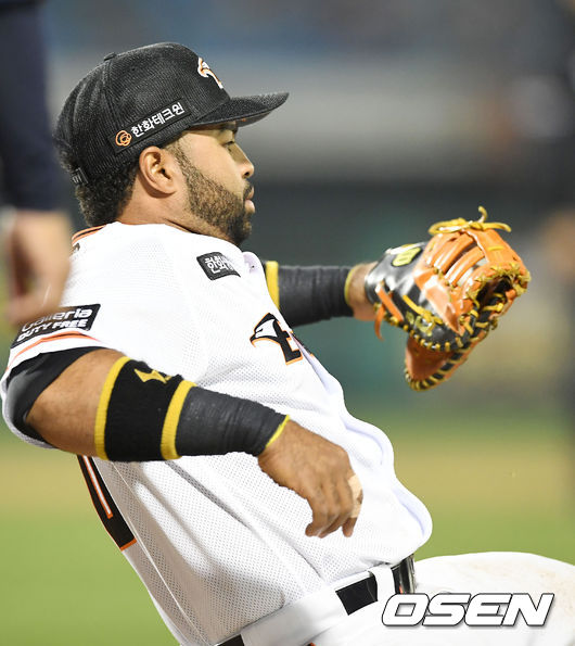 4일 대전 한화생명이글스파크에서 열린 '2017 타이어뱅크 KBO 리그' 한화 이글스와 NC 다이노스의 경기, 2회초 2사 주자 만루 NC 김태군의 3루수 앞 땅볼때 악송구를 잡아내 아웃 시킨 1루수 로사리오가 자리에서 일어서고 있다./ rumi@osen.co.kr