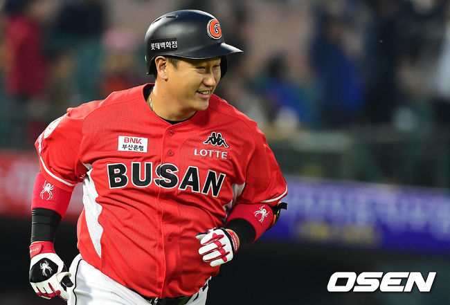 4일 오후 부산 사직야구장에서 열린 '2017 타이어뱅크 KBO 리그' 롯데 자이언츠와 넥센 히어로즈의 경기 1회말 1사 2루 이대호가 투런홈런을 치고 미소를 짓고 있다. / baik@osen.co.kr