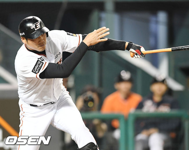 4일 대전 한화생명이글스파크에서 열린 '2017 타이어뱅크 KBO 리그' 한화 이글스와 NC 다이노스의 경기, 2회말 2사 한화 최진행이 중견수 앞 안타를 날리고 있다./ rumi@osen.co.kr