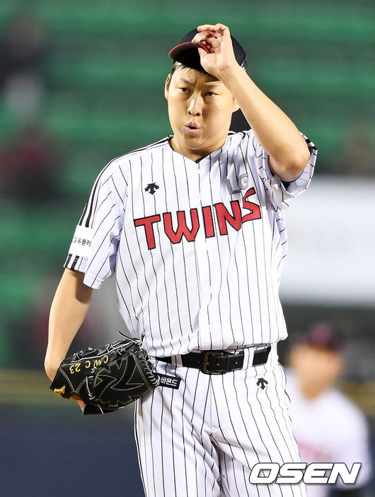 4일 오후 서울 잠실야구장에서 열린 '2017 타이어뱅크 KBO리그' LG 트윈스와 삼성 라이온스의 경기, 2회초 LG 차우찬이 삼성 이승엽을 상대하며 심호흡을 하고 있다. /jpnews@osen.co.kr
