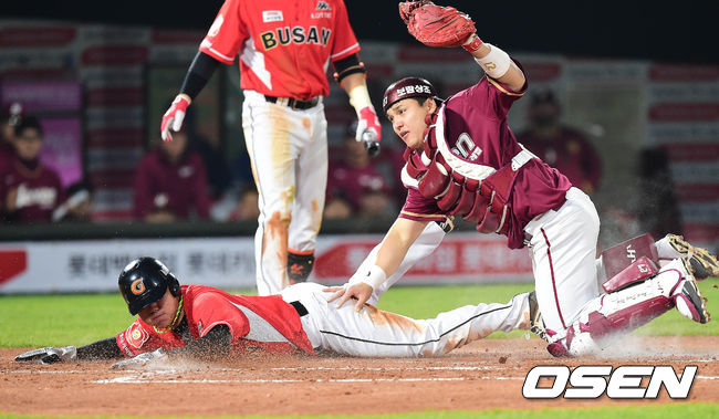 4일 오후 부산 사직야구장에서 열린 '2017 타이어뱅크 KBO 리그' 롯데 자이언츠와 넥센 히어로즈의 경기 2회말 1사 1,3루 3루주자 신본기가 더블스틸에 실패하고 있다. / baik@osen.co.kr