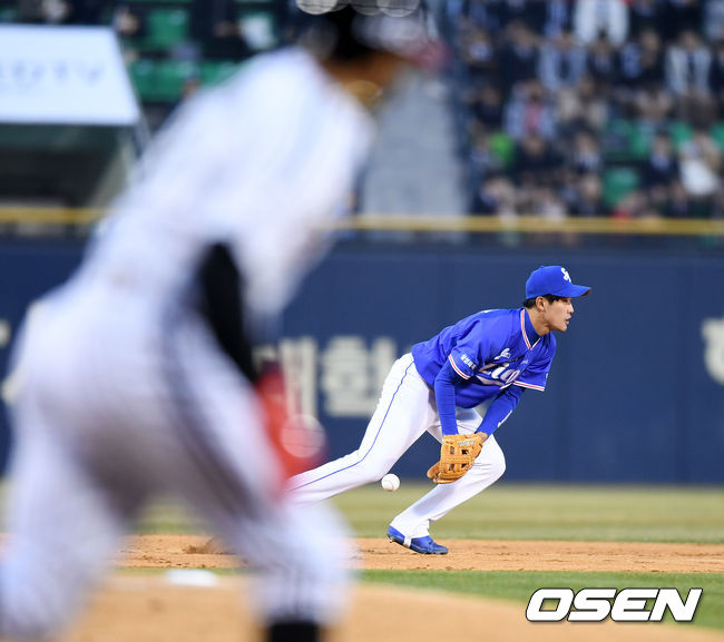 4일 오후 서울 잠실야구장에서 열린 '2017 타이어뱅크 KBO리그' LG 트윈스와 삼성 라이온스의 경기, 1회말 1사 1,2루에서 삼성 강한울이 LG 히메네스의 유격수 땅볼 타구에 실책을 범하고 있다. /jpnews@osen.co.kr