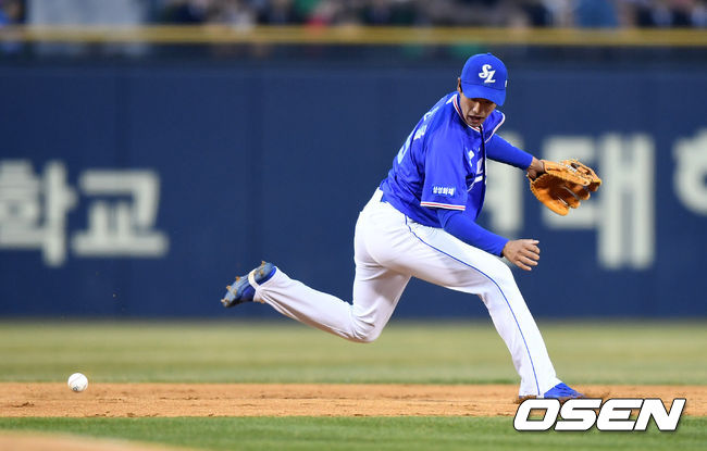 4일 오후 서울 잠실야구장에서 열린 '2017 타이어뱅크 KBO리그' LG 트윈스와 삼성 라이온스의 경기, 1회말 1사 1,2루에서 삼성 강한울이 LG 히메네스의 유격수 땅볼 타구에 실책을 범하고 있다. /jpnews@osen.co.kr