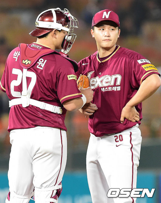 4일 오후 부산 사직야구장에서 열린 '2017 타이어뱅크 KBO 리그' 롯데 자이언츠와 넥센 히어로즈의 경기 2회말 박동원과 선발투수 최원태가 마운드에서 이야기를 나누고 있다. / baik@osen.co.kr