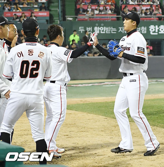 4일 대전 한화생명이글스파크에서 열린 '2017 타이어뱅크 KBO 리그' 한화 이글스와 NC 다이노스의 경기, 3회초를 마친 한화 선발 배영수가 덕아웃으로 들어오며 동료들과 하이파이브를 하고 있다./ rumi@osen.co.kr