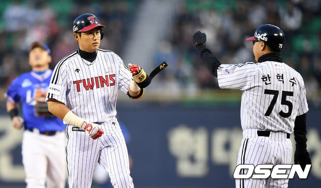 4일 오후 서울 잠실야구장에서 열린 '2017 타이어뱅크 KBO리그' LG 트윈스와 삼성 라이온스의 경기, 1회말 1사 만루에서 LG 채은성이 선제 1타점 우전 적시타를 날리고 한혁수 코치와 주먹을 맞대고 있다. /jpnews@osen.co.kr