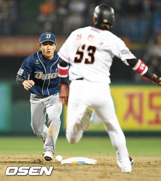 4일 대전 한화생명이글스파크에서 열린 '2017 타이어뱅크 KBO 리그' 한화 이글스와 NC 다이노스의 경기, 3회말 무사 주자 1루 한화 하주석의 땅볼 타구때 NC 유격수 손시헌의 실책으로 볼을 놓쳤을때 장민석이 2루로 향하고 있다./ rumi@osen.co.kr