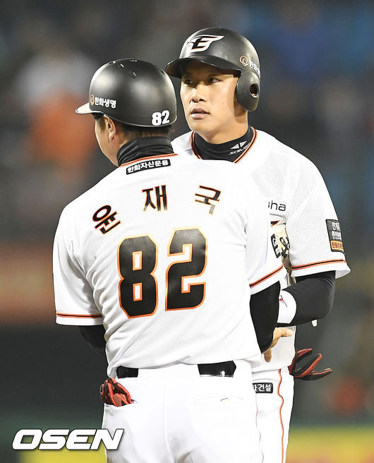 4일 대전 한화생명이글스파크에서 열린 '2017 타이어뱅크 KBO 리그' 한화 이글스와 NC 다이노스의 경기, 3회말 1사 주자 만루 한화 김원석이 2타점 적시타를 날린 후 2루에서 윤재국 코치와 하이파이브를 하고 있다./ rumi@osen.co.kr