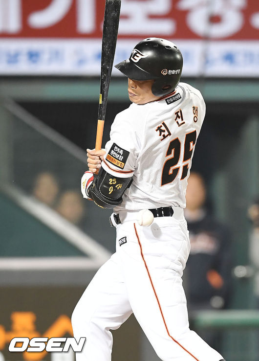 4일 대전 한화생명이글스파크에서 열린 '2017 타이어뱅크 KBO 리그' 한화 이글스와 NC 다이노스의 경기, 3회말 1사 주자 2,3루 한화 최진행이 타석에서 NC 선발 최금강이 던진 볼에 맞으며 주자 만루가 되고 있다. /rumi@osen.co.kr