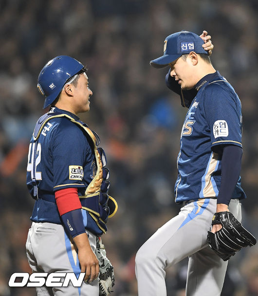 4일 대전 한화생명이글스파크에서 열린 '2017 타이어뱅크 KBO 리그' 한화 이글스와 NC 다이노스의 경기, 3회말 1사 주자 2,3루 NC 선발 최금강이 한화 최진행에게 몸에 맞는 볼을 던진 후 김태군과 얘기를 나누고 있다. /rumi@osen.co.kr