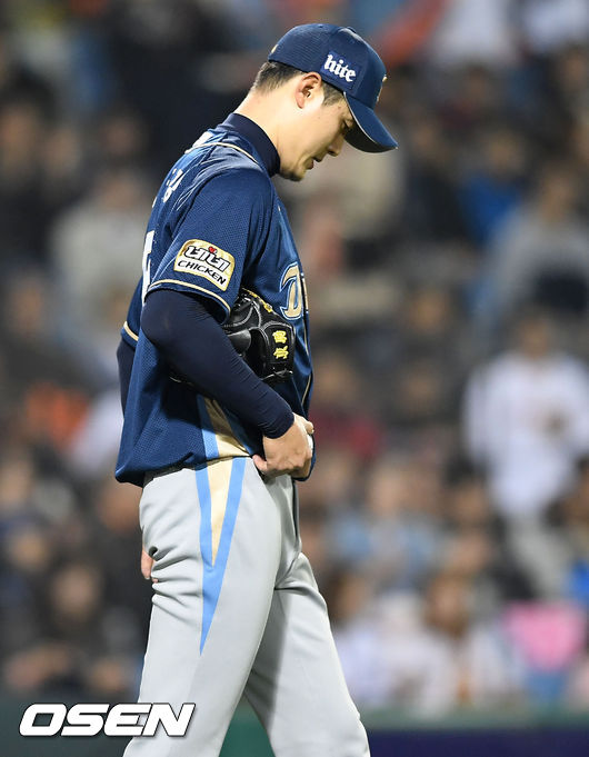 4일 대전 한화생명이글스파크에서 열린 '2017 타이어뱅크 KBO 리그' 한화 이글스와 NC 다이노스의 경기, 3회말 1사 주자 만루 한화 강경학에게 중견수 앞 2타점 적시타를 맞은 NC 선발 최금강이 고개를 떨구고 있다./ rumi@osen.co.kr