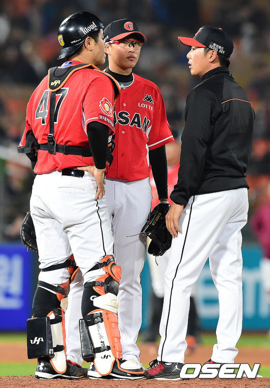 4일 오후 부산 사직야구장에서 열린 '2017 타이어뱅크 KBO 리그' 롯데 자이언츠와 넥센 히어로즈의 경기 6회초 1사 만루 박세웅이 김원형 코치와 이야기를 나누고 있다. / baik@osen.co.kr