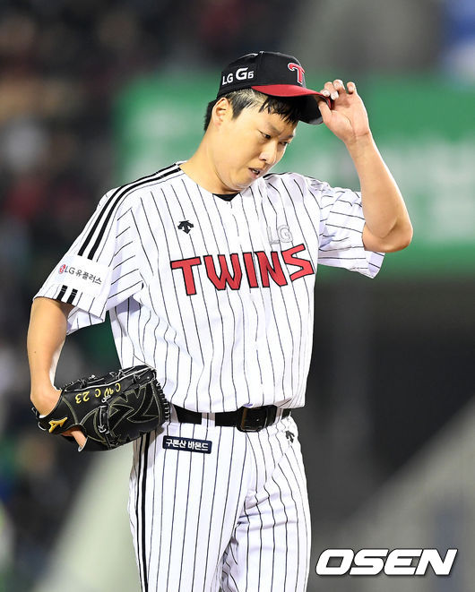 4일 오후 서울 잠실야구장에서 열린 '2017 타이어뱅크 KBO리그' LG 트윈스와 삼성 라이온스의 경기, 4회초 무사에서 LG 차우찬이 삼성 이승엽을 삼진으로 처리하며 땀을 닦고 있다. /jpnews@osen.co.kr