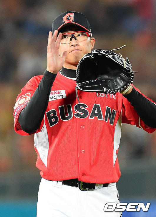 4일 오후 부산 사직야구장에서 열린 '2017 타이어뱅크 KBO 리그' 롯데 자이언츠와 넥센 히어로즈의 경기 6회초 2사 1,2루 고종욱을 땅볼로 처리한 박세웅이 글러브를 치며 기뻐하고 있다. / baik@osen.co.kr