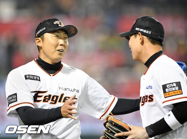 4일 대전 한화생명이글스파크에서 열린 '2017 타이어뱅크 KBO 리그' 한화 이글스와 NC 다이노스의 경기, 5회초를 마친 한화 배영수가 하주석과 포옹을 하며 기쁨을 나누고 있다./ rumi@osen.co.kr