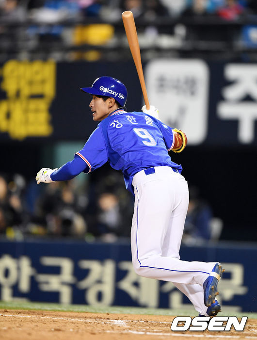 4일 오후 서울 잠실야구장에서 열린 '2017 타이어뱅크 KBO리그' LG 트윈스와 삼성 라이온스의 경기, 5회초 무사에서 삼성 강한울이 좌중간 안타를 날리고 있다. /jpnews@osen.co.kr