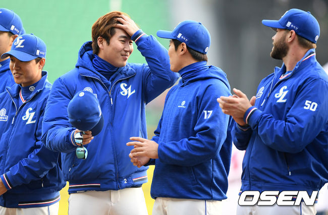 4일 오후 서울 잠실야구장에서 열린 '2017 타이어뱅크 KBO리그' LG 트윈스와 삼성 라이온스의 경기, 식전행사에서 LG 팬들이 삼성 우규민을 환호로 맞이하자 우규민이 미소짓고 있다. /jpnews@osen.co.kr