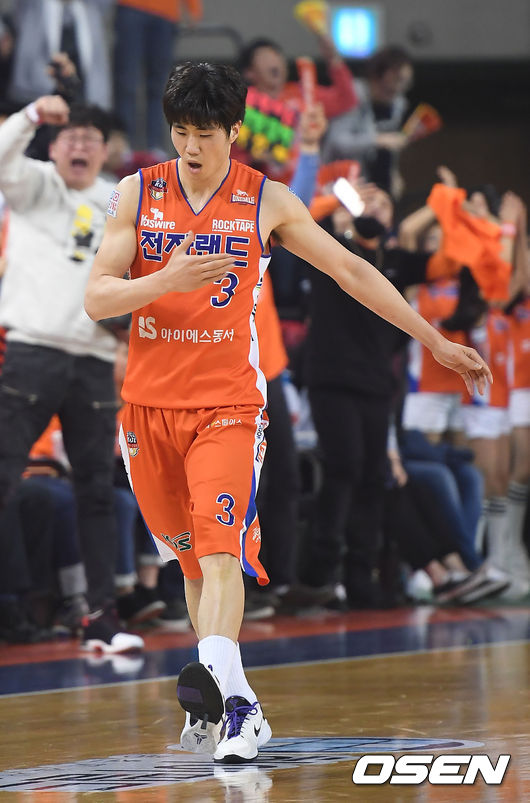 4일 오후 인천 부평구 삼산월드체육관에서 '2016-2017 KCC 프로농구' 6강 플레이오프 3차전 인천 전자랜드와 서울 삼성의 경기 3쿼터 전자랜드 김지완이 득점을 올린 뒤 세레머니를 하고 있다./youngrae@osen.co.kr