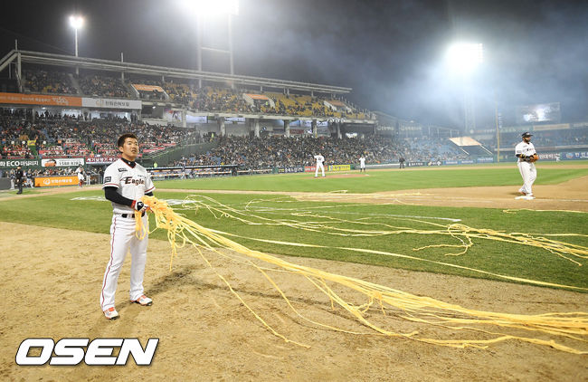 4일 대전 한화생명이글스파크에서 열린 '2017 타이어뱅크 KBO 리그' 한화 이글스와 NC 다이노스의 경기, 클리닝 타임에 진행된 한화 홈 개막전 축하 불꽃놀이때 날아온 폭죽 종이가 그라운드에 날아오자 한화 정근우가 정리를 하고 있다./ rumi@osen.co.kr