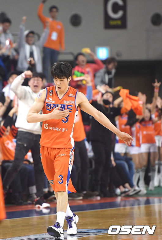 4일 오후 인천 부평구 삼산월드체육관에서 '2016-2017 KCC 프로농구' 6강 플레이오프 3차전 인천 전자랜드와 서울 삼성의 경기 3쿼터 전자랜드 김지완이 득점을 올린 뒤 세레머니를 하고 있다./youngrae@osen.co.kr