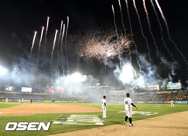 4일 대전 한화생명이글스파크에서 열린 '2017 타이어뱅크 KBO 리그' 한화 이글스와 NC 다이노스의 경기, 클리닝 타임에 진행된 한화 홈 개막전 축하 불꽃놀이가 진행되고 있다./ rumi@osen.co.kr