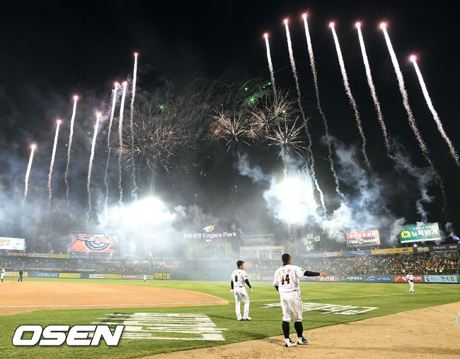 4일 대전 한화생명이글스파크에서 열린 '2017 타이어뱅크 KBO 리그' 한화 이글스와 NC 다이노스의 경기, 클리닝 타임에 진행된 한화 홈 개막전 축하 불꽃놀이가 진행되고 있다./ rumi@osen.co.kr