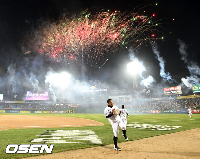4일 대전 한화생명이글스파크에서 열린 '2017 타이어뱅크 KBO 리그' 한화 이글스와 NC 다이노스의 경기, 클리닝 타임에 진행된 한화 홈 개막전 축하 불꽃놀이가 진행되고 있다./ rumi@osen.co.kr
