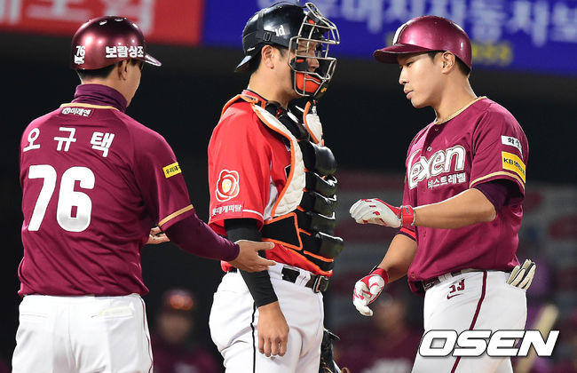 4일 오후 부산 사직야구장에서 열린 '2017 타이어뱅크 KBO 리그' 롯데 자이언츠와 넥센 히어로즈의 경기 9회초 선두타자 고종욱이 솔로홈런을 치고 오규택 코치와 하이파이브를 하고 있다. / baik@osen.co.kr