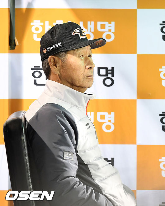 4일 대전 한화생명이글스파크에서 열린 '2017 타이어뱅크 KBO 리그' 한화 이글스와 NC 다이노스의 경기, 7회말 1사 한화 김태균 타석에서 한화 덕아웃의 김성근 감독이 생각에 잠겨있다./ rumi@osen.co.kr