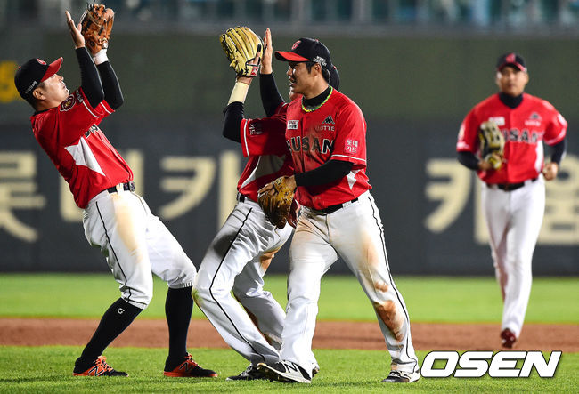 4일 오후 부산 사직야구장에서 열린 '2017 타이어뱅크 KBO 리그' 롯데 자이언츠와 넥센 히어로즈의 경기 종료 후 롯데 선수들이 승리의 기쁨을 나누고 있다. / baik@osen.co.kr