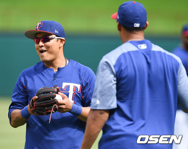 4일 오후(현지시간) 미국 텍사스주 알링턴 글로브 라이브 파크에서 열린 2017 메이저리그(MLB) 텍사스 레인저스와 클리블랜드 인디언스의 경기에 앞서 추신수가 고메즈와 이야기를 나누고 있다. / soul1014@osen.co.kr