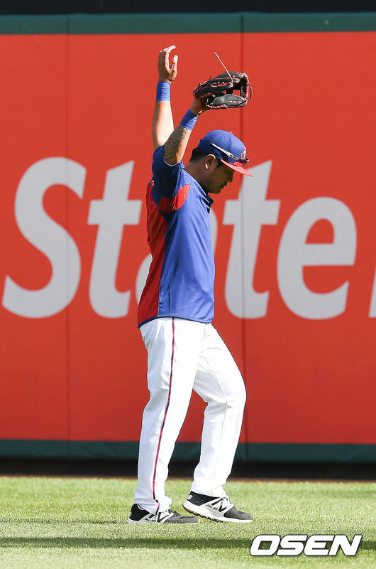 4일 오후(현지시간) 미국 텍사스주 알링턴 글로브 라이브 파크에서 열린 2017 메이저리그(MLB) 텍사스 레인저스와 클리블랜드 인디언스의 경기에 앞서 추신수가 송구연습에 앞서 어깨를 풀고 있다. / soul1014@osen.co.kr