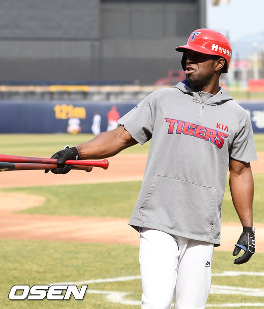 7일 오후 광주 기아챔피언스 필드에서 '2017 타이어뱅크 KBO 리그' KIA 타이거즈와 한화 이글스의 경기가 열릴 예정인 가운데 경기 전 훈련시간에 KIA 버나디나가 타격연습을 위해 덕아웃에서 나오며 사인을 보내고 있다. / rumi@osen.co.kr