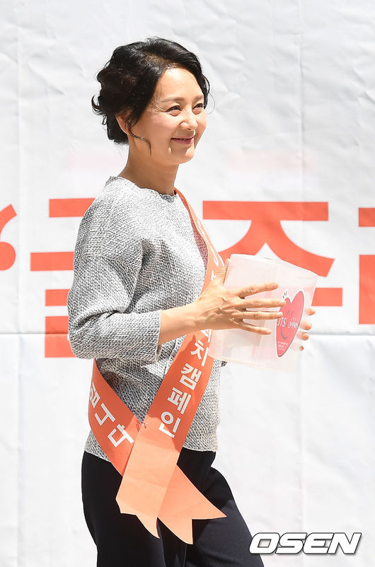 5일 오후 서울 명동 KEB하나은행 앞 특설무대에서 진행된 UN국제구호단체 JTS(Join Together Society) 거리모금 캠페인에 참석한 배우 배종옥이 무대에 오르고 있다. / youngrae@osen.co.kr