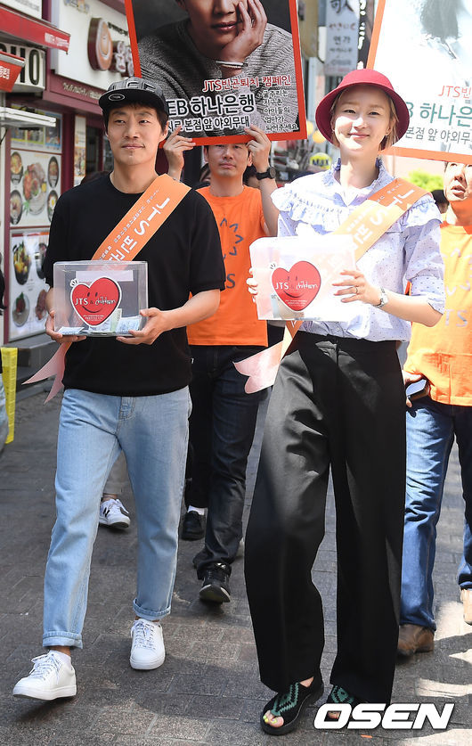 5일 오후 서울 명동 KEB하나은행 앞 특설무대에서 진행된 UN국제구호단체 JTS(Join Together Society) 거리모금 캠페인에 참석한 이희준, 이혜정 부부가 모금을 받고 있다. / youngrae@osen.co.kr