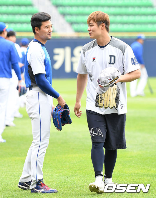 6일 서울 잠실야구장에서 열리는 '2017 타이어뱅크 KBO 리그' 두산 베어스와 삼성 라이온즈의 경기를 앞두고, 두산 민병헌과 삼성 김상수가 인사를 나누고 있다. /dreamer@osen.co.kr