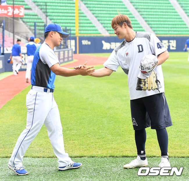 6일 서울 잠실야구장에서 열리는 '2017 타이어뱅크 KBO 리그' 두산 베어스와 삼성 라이온즈의 경기를 앞두고, 두산 민병헌과 삼성 김헌곤이 인사를 나누고 있다. /dreamer@osen.co.kr