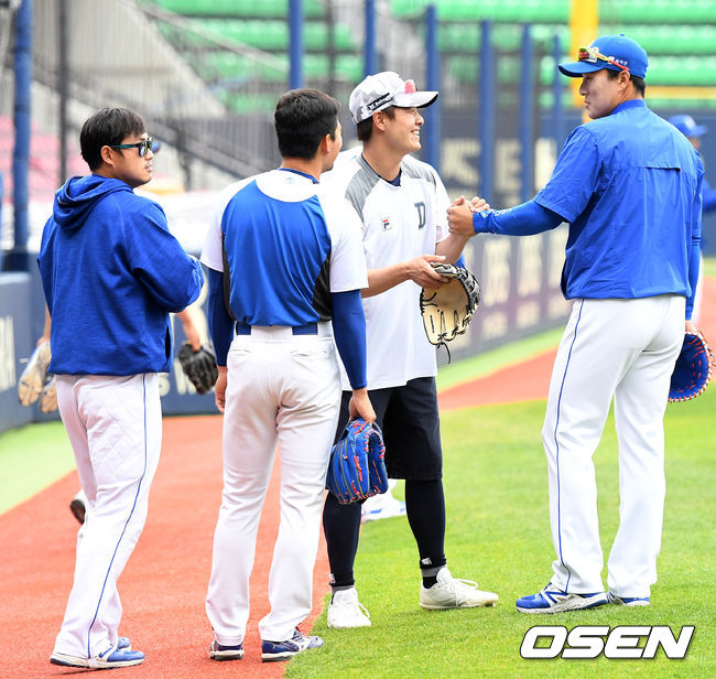 6일 서울 잠실야구장에서 열리는 '2017 타이어뱅크 KBO 리그' 두산 베어스와 삼성 라이온즈의 경기를 앞두고, 두산 민병헌이 삼성 이승엽-이지영-김상수와 인사를 나누고 있다. /dreamer@osen.co.kr