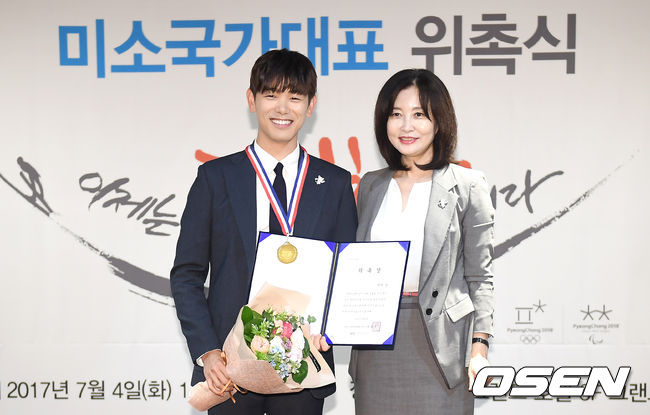 가수 에릭남이 4일 오전 서울 중구 티마크그랜드호텔에서 진행된 2017 명예미소 국가대표 위촉식 참석해 한경아 한국방문위원회 사무국장과 포토타임을 갖고 있다. / youngrae@osen.co.kr