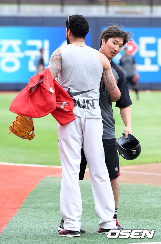 7일 오후 경기도 수원kt위즈파크에서 열릴 ‘2017 타이어뱅크 KBO 리그’ kt wiz와 KIA 타이거즈의 경기에 앞서 KIA 헥터와 kt 이진영이 인사를 나누고 있다. /sunday@osen.co.kr