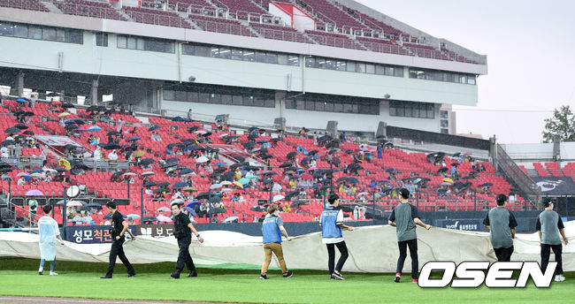 갑작스런 비에 방수포 덮는 kt위즈파크