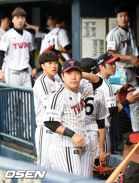 경기 지연, 내리는 빗방울을 바라보는 LG 선수들