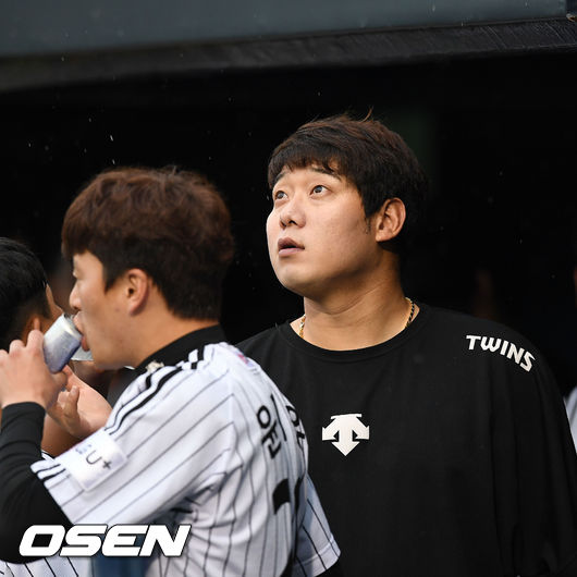 7일 오후 서울 잠실구장에서 '2017 타이어뱅크 KBO 리그' LG 트윈스와 한화 이글스의 경기가 열릴 예정인 가운데 경기 시작 전 빗줄기가 굵어지면서 경기가 지연되고 있다. LG 류제국이 덕아웃에서 내리는 빗방울을 바라보며 손을 내밀고 있다. / rumi@osen.co.kr