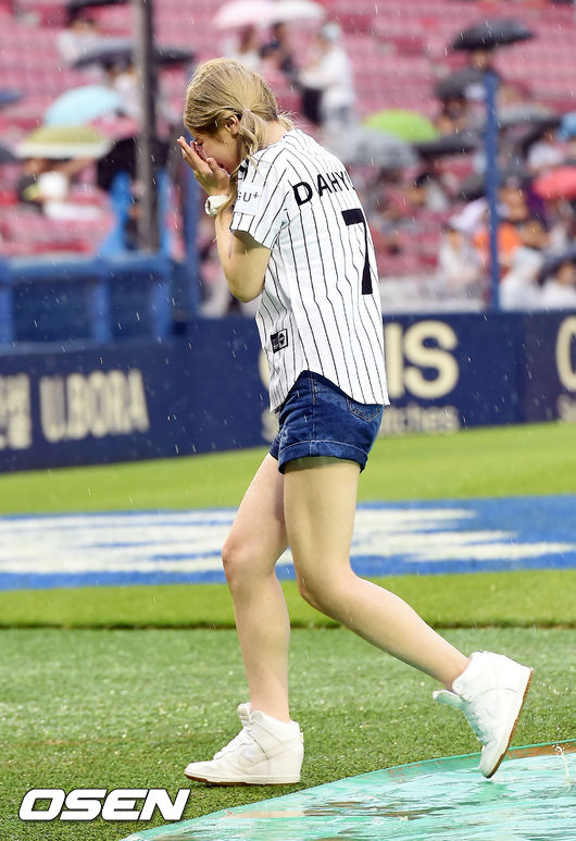 7일 오후 서울 잠실구장에서 '2017 타이어뱅크 KBO 리그' LG 트윈스와 한화 이글스의 경기가 열릴 예정이었으나 우천 취소되며 시구가 예정되어 있던 트와이스의 다현이 우천 세레머니를 한 후 얼굴을 가리고 퇴장하고 있다/ rumi@osen.co.kr