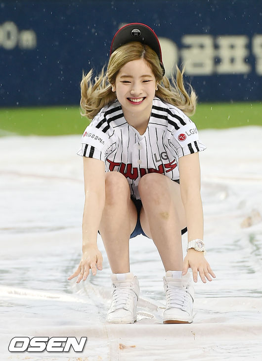 7일 오후 서울 잠실구장에서 '2017 타이어뱅크 KBO 리그' LG 트윈스와 한화 이글스의 경기가 열릴 예정이었으나 우천 취소되며 시구가 예정되어 있던 트와이스의 다현이 우천 세레머니를 하고 있다./ rumi@osen.co.kr