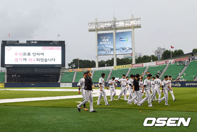 7일 오후 서울 잠실구장에서 '2017 타이어뱅크 KBO 리그' LG 트윈스와 한화 이글스의 경기가 열릴 예정이었으나 경기 시작 전 내리는 비로 우천 취소되고 있다./ rumi@osen.co.kr
