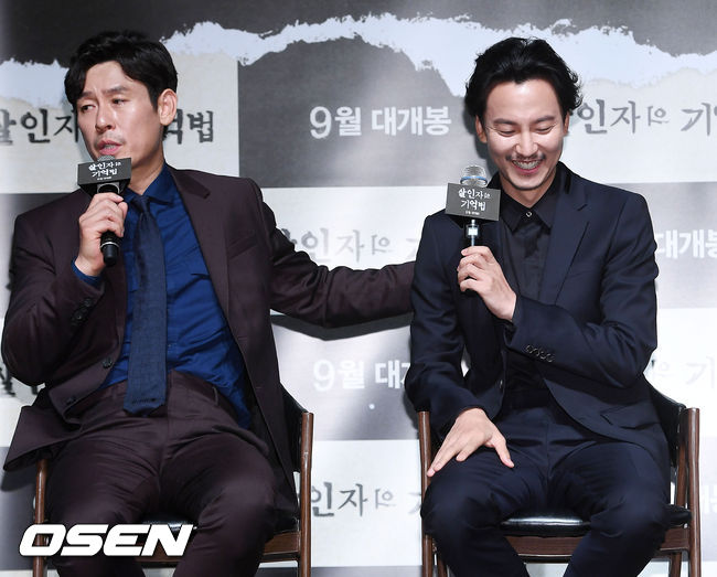 8일 오전 서울시 강남구 압구정CGV에서 열린 영화 '살인자의 기억법' 제작보고회서 김남길이 설경구의 칭찬에 쑥스러워하고 있다. / rumi@osen.co.kr