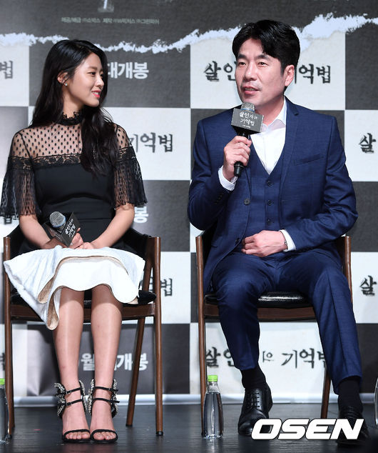 8일 오전 서울시 강남구 압구정CGV에서 열린 영화 '살인자의 기억법' 제작보고회서 오달수의 말에 김설현이 미소짓고 있다. / rumi@osen.co.kr